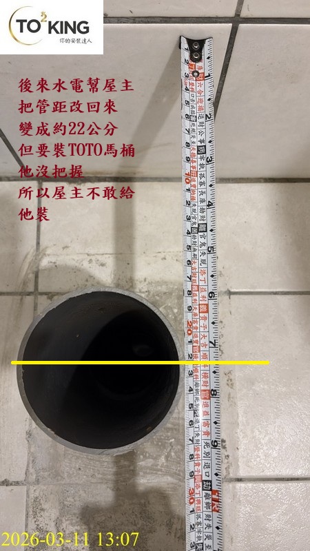 現場管距水電改到22公分 但TOTO馬桶他裝不上去 雖有概念但沒把握 卻想嘗試幫屋主裝 但屋主不敢冒險